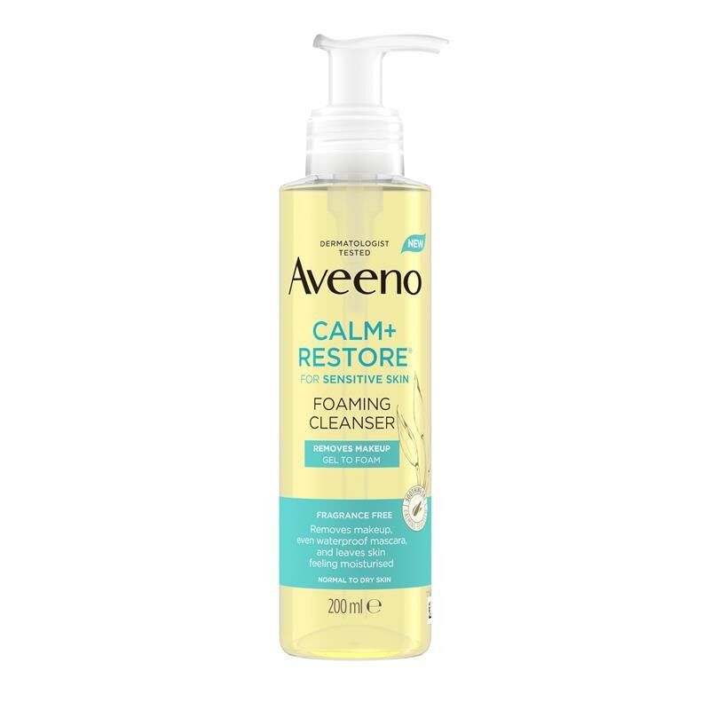 Effortlessly cleanse and foam away make up with the Aveeno Face Calm+Restore Foaming Cleanser 200ml. Formulated for sensitive skin, the cleanser transforms from a gel to a gentle foam and removes even long-wear makeup and waterproof mascara.Formulated with Soothing Oat, Calming Feverfew, and Hyaluronic Acid, the Foaming Cleanser effectively removes dirt, makeup, impurities, and oil and does not strip skin.