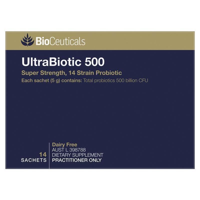 UltraBiotic 500 is a combination of 14 probiotic strains providing 500 billion CFU per sachet. This high strength probiotic provides support for normal healthy digestive and immune system functions in a convenient one-a-day dose. Probiotics help maintain and restore beneficial gut flora during and after antibiotic use. UltraBiotic 500 can maintain bowel regularity and relieve digestive discomfort and abdominal bloating. Part of BioCeuticals range of gut health supplements. This product requires refrigeration. Store at 2 C to 8 C. (Refrigerate. Do not freeze).Suitable For: Adults only