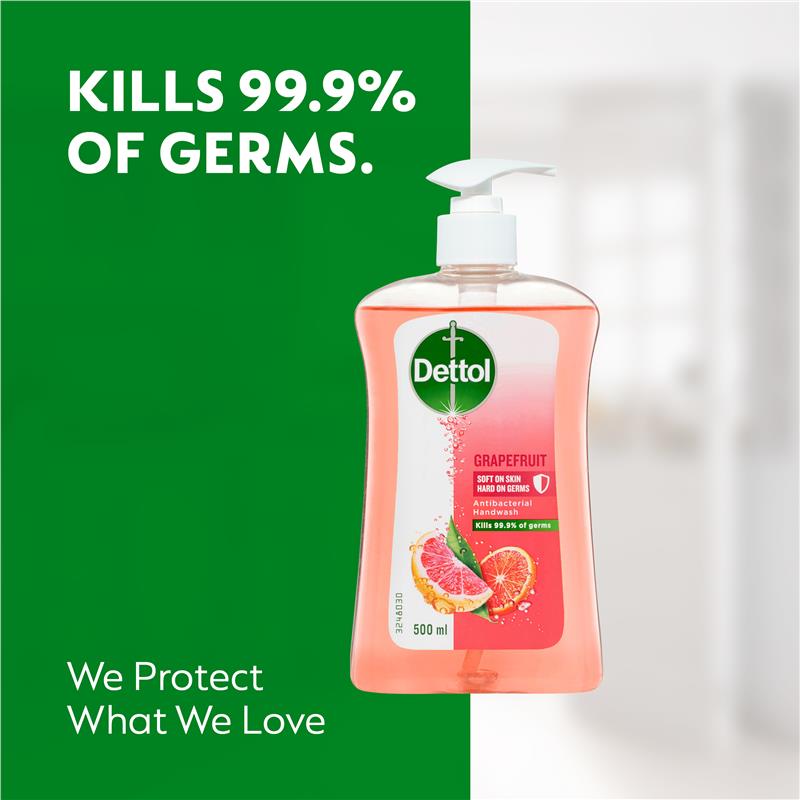 Dettol Antibacterial Liquid Handwash is soft on skin, hard on germs and now available in a 500ml pump!The hand wash formula with a great Grapefruit fragrance kills 99.9% of germs, is suitable for everyday use and contains added moisturisers.