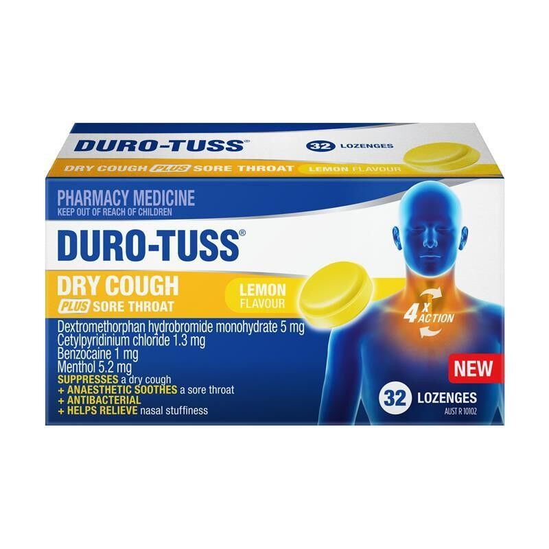 DURO-TUSS Dry Cough PLUS Sore Throat Lemon Lozenges have a 4X ACTION. SUPPRESSES a dry cough. Plus ANAESTHETIC SOOTHES a sore throat. Plus ANTIBACTERIAL. Plus HELPS RELIEVE nasal stuffiness. Suitable for 6 years+. GET DURO-TOUGH ON YOUR COUGH WITH DURO-TUSSSuitable For: Adults and Children 6 years+
