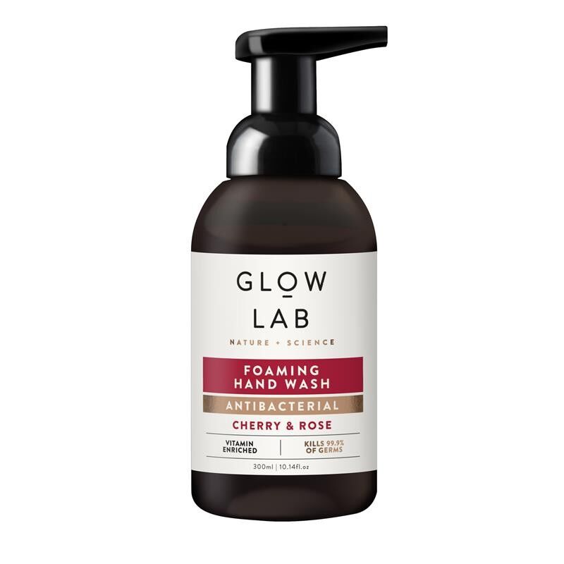 Glow Lab Antibacterial Cherry & Rose Foaming Hand Wash gently cleanses, protects against 99.9% of germs, and hydrates and softens skin.