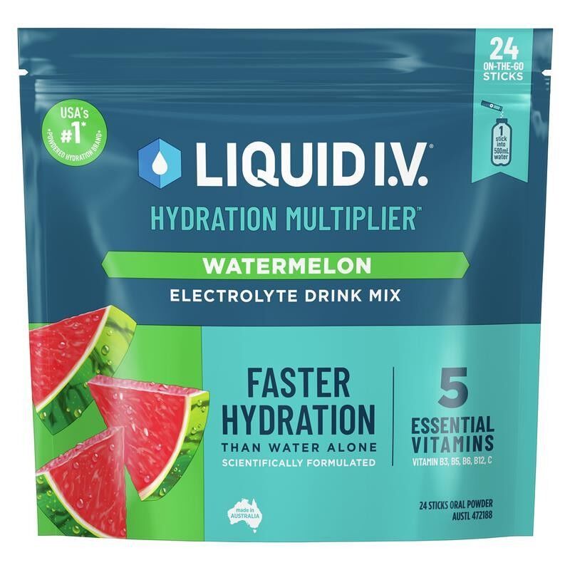 Liquid I.V. Hydration Multiplier Watermelon Electrolyte Drink Mix helps restore electrolyte imbalance that occurs through performance, heat/sun, travel, and adventure. It is formulated with 5 essential vitamins B3, B5, B6, B12, and C, along with potassium, to hydrate faster than water alone. It is also vegan. Dive into the refreshing taste of watermelon. This thirst quenching blend captures the essence of summer with every sip. This drink mix is free from artificial colours and sweeteners, for that fresh, natural taste. The convenience of the single-serving, travel-friendly stick allows for easy use anywhere. Simply pour one easy-to-open packet into 500 mL water, mix or shake, and enjoy. We believe that a healthier world for all begins with equitable access to clean and abundant water. You can trust that every time you buy Liquid I.V. you are supporting both our product donations to those in need and our partnerships and grants to innovative organisations that expand clean water access around the world. ALWAYS READ THE LABEL AND FOLLOW THE DIRECTIONS FOR USE.Boxed Contents: 24 PC
