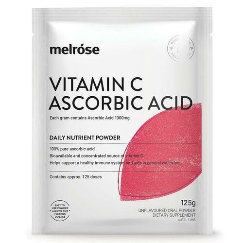 Melrose Vitamin C Ascorbic Acid is an easy to use nutrient powder that can be taken daily to provide antioxidant support for healthy immune function. Vitamin C is an essential water-soluble vitamin that the body cannot make or store, so it is important that an adequate amount is consumed daily through the diet. Warnings f symptoms persist seek the advice of your healthcare practitioner. Vitamin supplements should not replace a balanced diet. Not to be used in children under two years of age without medical advice. Not suitable for children. Ingredients Each 1g dose contains: Ascorbic Acid 1000mg Common Uses Helps support a healthy immune system Helps reduce the severity and duration of colds Contributes to the production of collagen and cartilage supporting healthy bones, skin and teeth Assists in the healthy development and growth of bones Supports connective tissues Rich source of antioxidants Supports body¡¯s detoxification Populations with exposure to pollution may benefit from taking vitamin C Helps iron absorption Aids in general wellbeing
