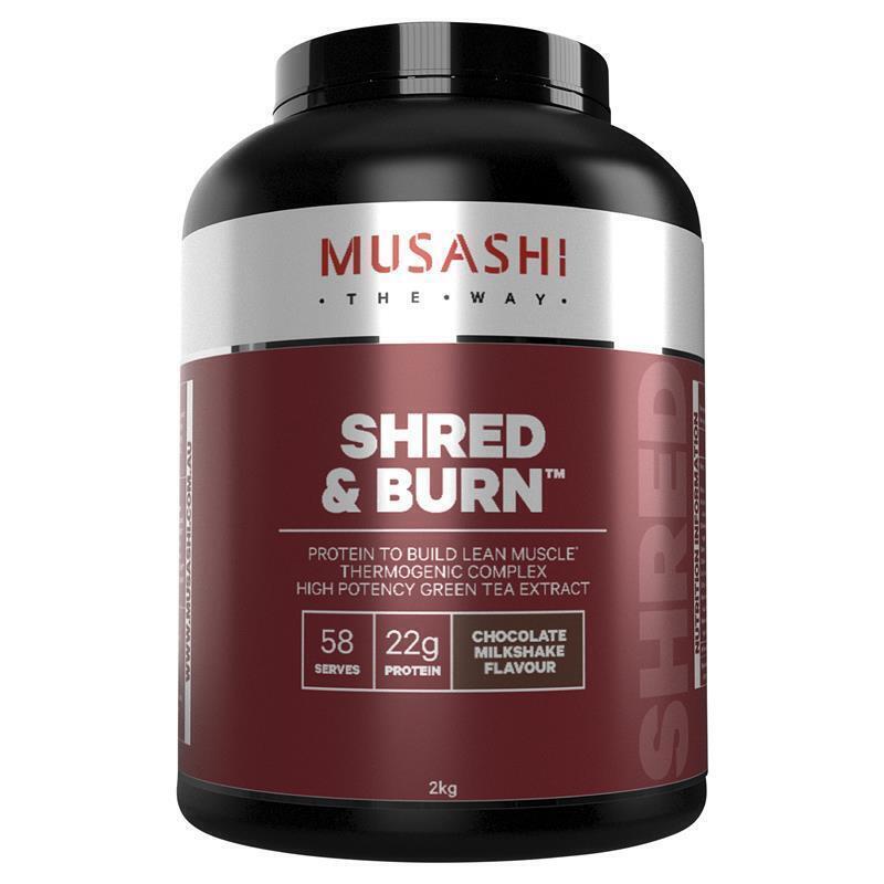 MUSASHI SHRED AND BURNTM is an optimised protein powder providing you with a powerful blend of active ingredients designed to support your lean muscle goals. MUSASHI SHRED AND BURNTM is scientifically formulated using Whey protein Concentrate and Whey Protein Isolate in an advanced muscle shredding complex. This lean muscle formula is enhanced with key SHRED AND BURN ingredients: L-carnitine and Green Tea extract to support your goals in a delicious formula that tastes great and mixes with ease. Trusted Sports NutritionProduct Claims: PROTEIN TO BUILD LEAN MUSCLE*, THERMOGENIC COMPLEX, HIGH POTENCY GREEN TEA EXTRACT