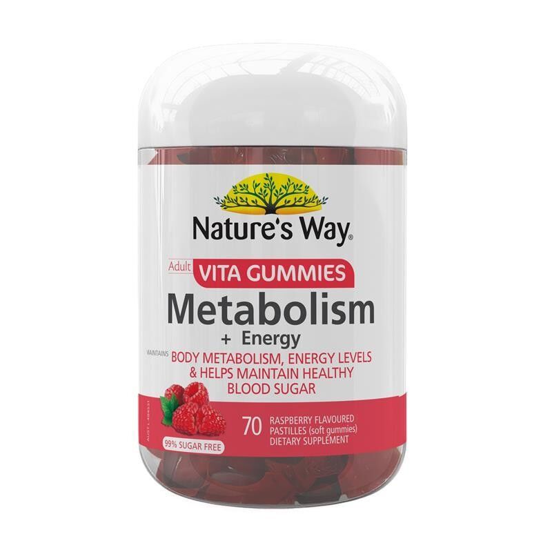 Nature's Way Adult Vita Gummies Metabolism + Energy maintains healthy body metabolism and metabolic rate to support active bodies and energy production. Specially formulated to help keep your blood sugar levels balanced and aid carbohydrate metabolism, for steady energy throughout the day.