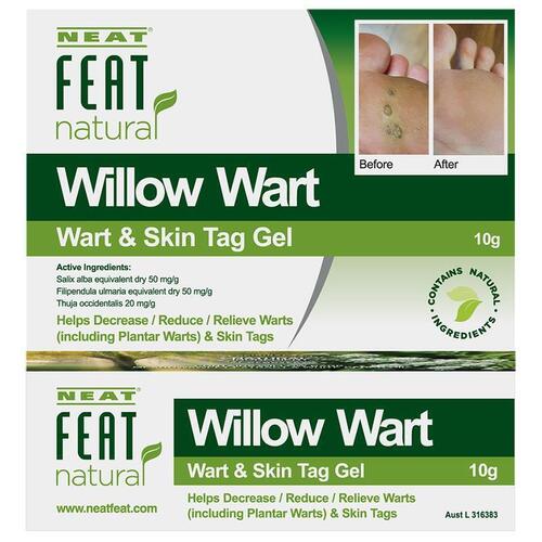 Neat Feat Natural Willow Wart, Wart & Skin Tag Gel is comprised of natural plant extracts, based on a formula traditionally used in herbal medicine containing natural ingredients. Neat Feat Willow Wart Will Help Decrease, Reduce, Relieve Warts (including Plantar Warts) & Skin Tags. Neat Feat Natural Willow Wart is the Original and Only Natural ingredient Wart Remover Gel. it contains Willow Bark Meadowsweet Extract & White Cedar Oil.
