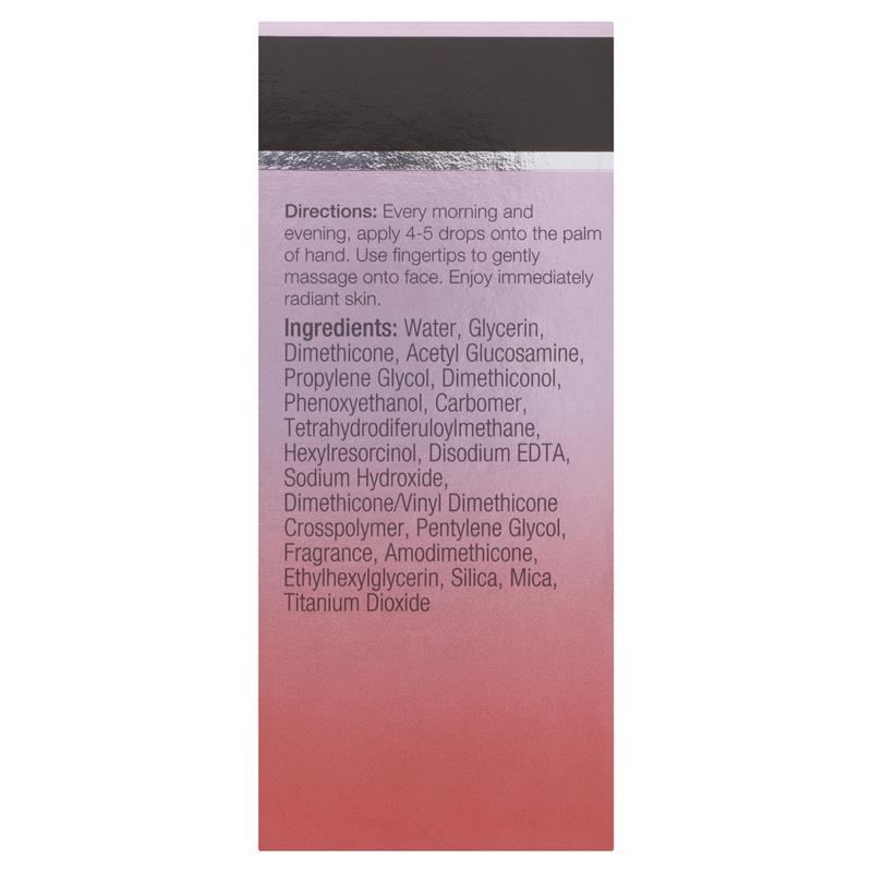 Water, Glycerin, Dimethicone, Acetyl Glucosamine, Propylene Glycol, Dimethiconol, Phenoxyethanol, Carbomer, Tetrahydrodiferuloylmethane, Hexylresorcinol, Disodium EDTA, Sodium Hydroxide, Dimethicone/Vinyl Dimethicone Crosspolymer, Pentylene Glycol, Fragrance, Amodimethicone, Ethylhexylglycerin, Silica, Mica, Titanium Dioxide.