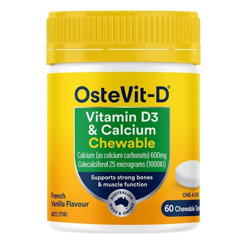 OsteVit-D One-A-Day Vitamin D3 & Calcium chewable tablet in a pleasant tasting French Vanilla flavour suports bone density & strength and healthy immune system function. Each chewable tablet contains 1000IU of Vitamin D3 and 600mg Calcium, for a convenient One-A-Day dose.Size: 60 Chewable tablets