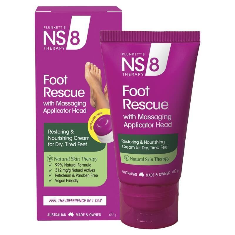 Plunkett's NS8 Foot Rescue is a vegan-friendly, lightweight, fast-absorbing cream that delivers instant relief to dry, tired and sore feet. The innovative massaging applicator head delivers targeted hydration while gently exfoliating, leaving weary feet and heels feeling refreshed, smooth and well-nourished.