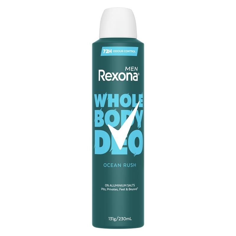 Stay fresh all over with Rexona Men Ocean Rush Whole Body Deodorant. This aluminium-free deodorant for men provides 72 hours of odour control so you can overcome your limits. Our whole body deodorant features Rexona's patented Body Adapt Technology, which stops odour before it even starts. This men''s deodorant spray offers a herbal and woody scent with a clean, fresh feel. Its quick-drying formula leaves less residue and feels light and refreshing on the skin, providing nearly instant freshness. Use it wherever you need to control odour all over - including your pits, privates, feet and beyond, but excluding your face. Avoid contact with eyes and broken skin. Stop use if rash or irritation occurs. Every part of your body has a unique microbiome, which causes body odour to vary across different areas. Only Rexona Whole Body Deodorant adapts to you - wherever you need it - so you can overcome your limits. Our whole body deodorant sprays work over a large surface area, making them a convenient choice. At Rexona, we want to inspire confidence in everyone to move more and go further. We're here to support your journey with an aluminium-free deodorant spray that keeps you fresh all over. Rexona. It won't let you down.Size: 230ml
