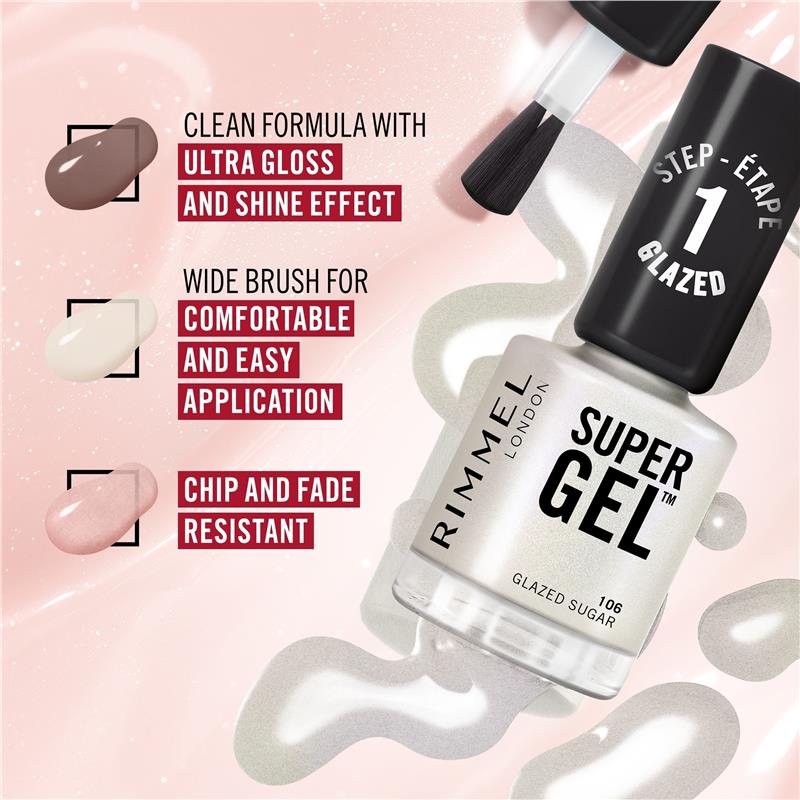 Rimmel SuperGel Nail Polish comes in a new clean formula for a bold gel-like manicure at home with an easy 2-step application that lasts up to 14 days* *Including re-application of top coat on day 7. Providing 3D glossy shine and intense colour coverage in just one stroke, without the need for a base coat or UV light. Clean formula with ultra gloss and shine effect. Wide brush for comfortable and easy application. Chip and fade resistant. Apply 2 coats of super gel colour, followed by the top coat for a bold and long-lasting gel-like manicure.KEY FEATURES